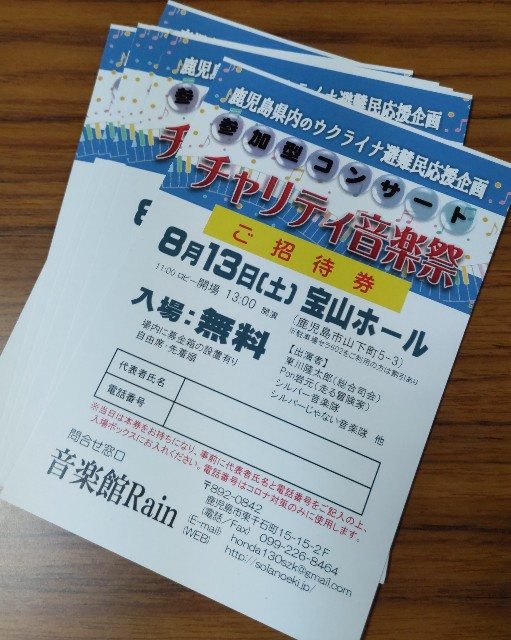 本田さんは来月、8月13日(土)に宝山ホールを借り切り、音楽関係者を集めてウクライナ避難民支援のチャリティコンサートを開催します。ちなみに宝山ホールは鹿児島市内のコンサートホールで、私も霧島音楽祭の演奏を聴きに何回も行っています。