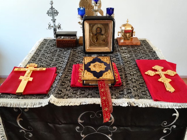 午後、妻と聖堂の内装の布類を金色から黒へ、燭台のグラスを赤から紺色に交換しました。